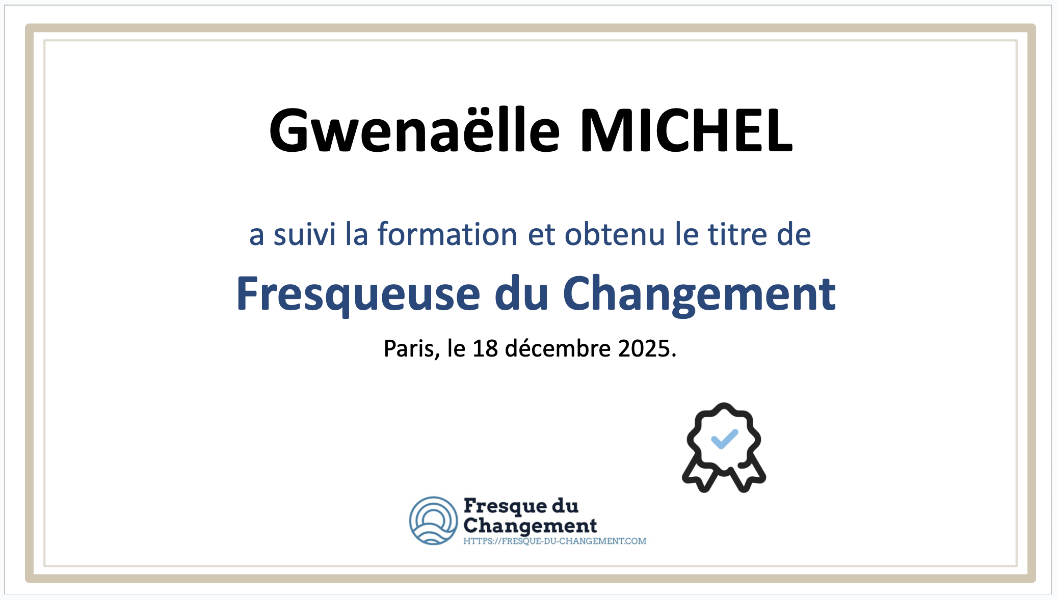 - Certification d’animatrice de la fresque du changement – Paris – 2025.